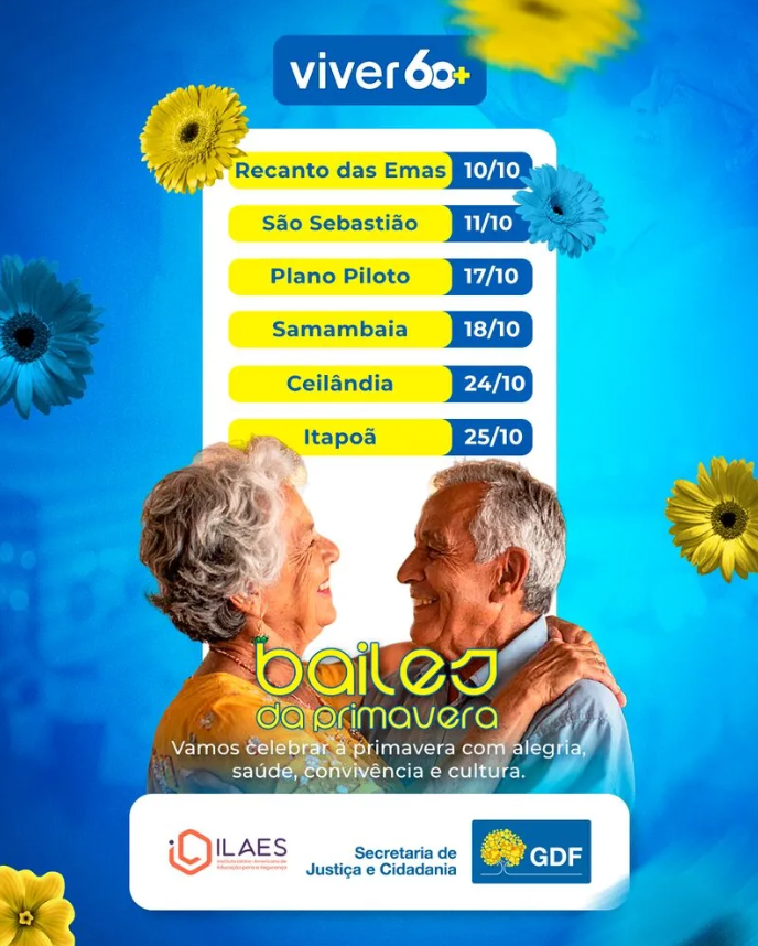 O Projeto Viver 60+, realizado pelo Instituto Latino-Americano de Educação para a Segurança (ILAES) em parceria com a Secretaria de Justiça e Cidadania do Distrito Federal (SEJUS/DF), promove em outubro uma série de Bailes da Primavera voltados para a terceira idade. A iniciativa busca celebrar a estação com música, dança e integração social, reforçando o valor da convivência intergeracional e a importância do envelhecimento ativo.